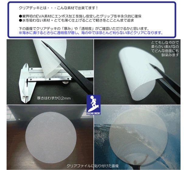 業界初のワックス不要でサーフィン革命をもたらしたクリアデッキです。